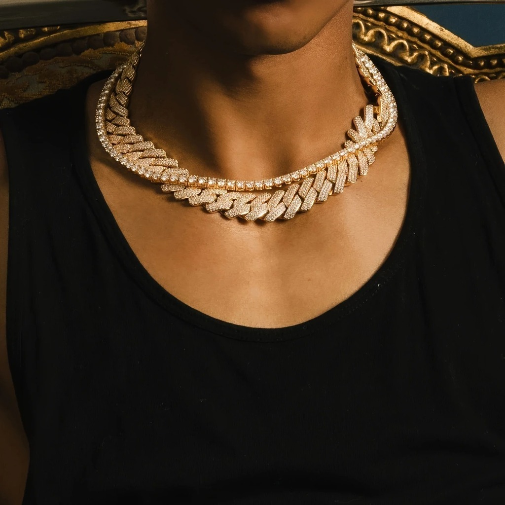 La versión helada más brutal! La Cadena Cubana Miami Premium 20 mm Oro / Oro Blanco es máxima presencia con un acabado que grita lujo. Elaborada con cristales 5A de maxima calidad y acabados perfectos.